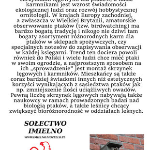 zewnątrz. Wszystkie budki są również otwierane (należy je zimą czyścić) i takie rozdawaliśmy mieszkańcom. Tym sposobem w Imielnie pojawiły się budki różnych typów: A, A1, B, D i E.